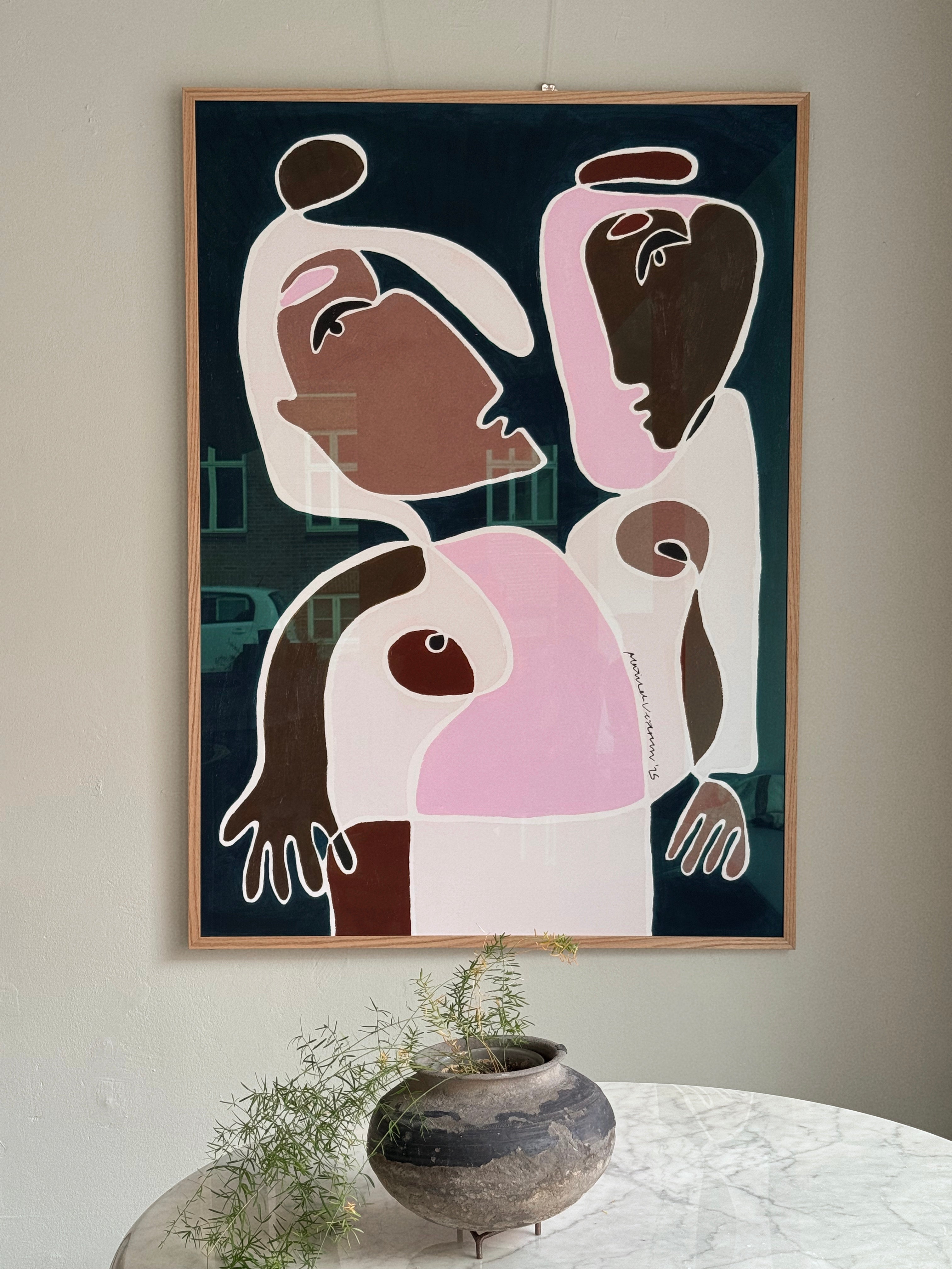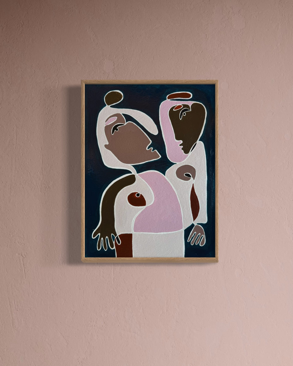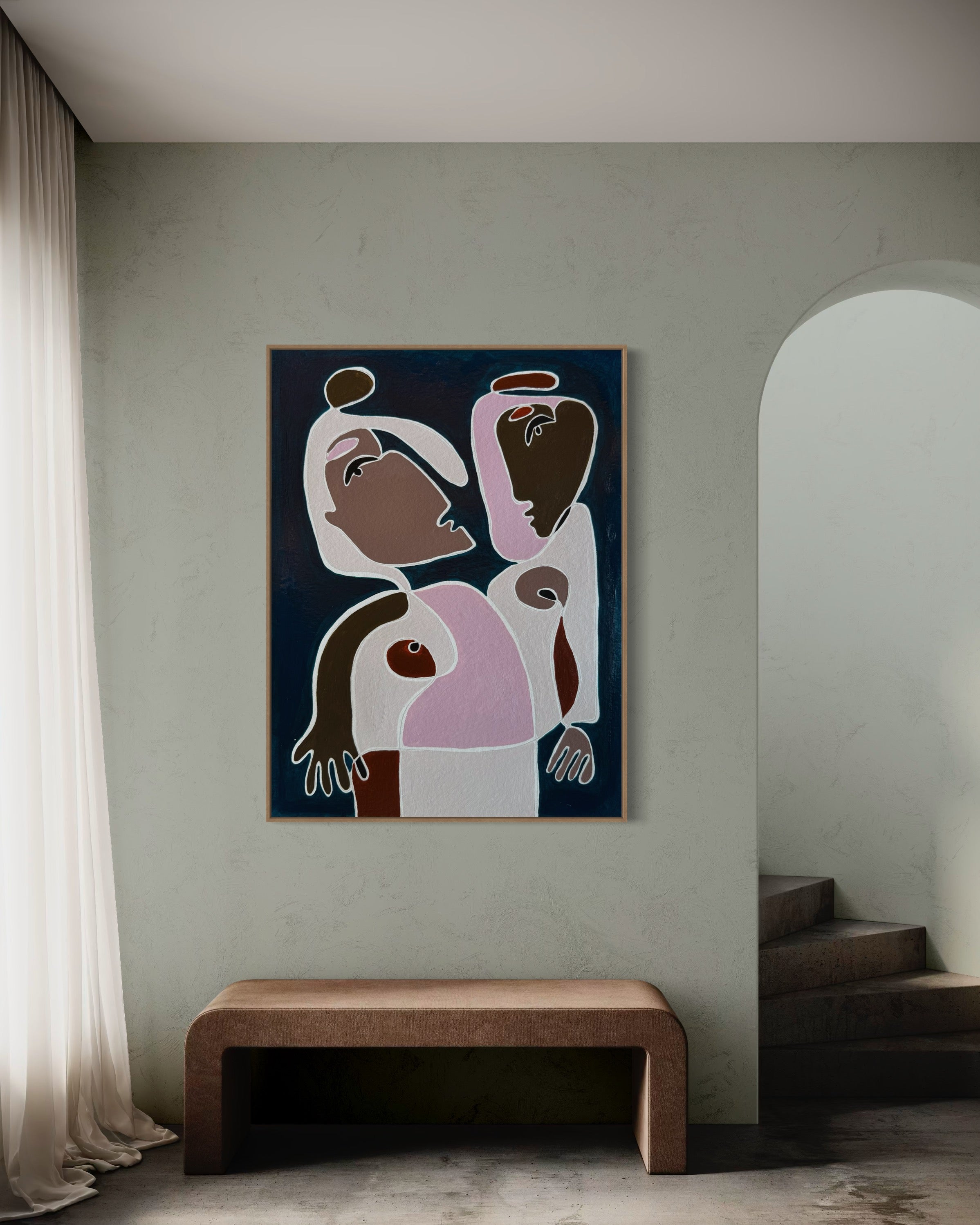 Clio skildrer mødet mellem flere figurer i et tæt samspil. De mørke baggrunde står i kontrast til de bløde nuancer af rosa, brun og hvid, som tilsammen skaber en følelse af nærhed og forbindelse. Værket indfanger øjeblikket, hvor kroppe og blikke flettes ind i hinanden – et billede på samhørighed og menneskelig tilknytning.