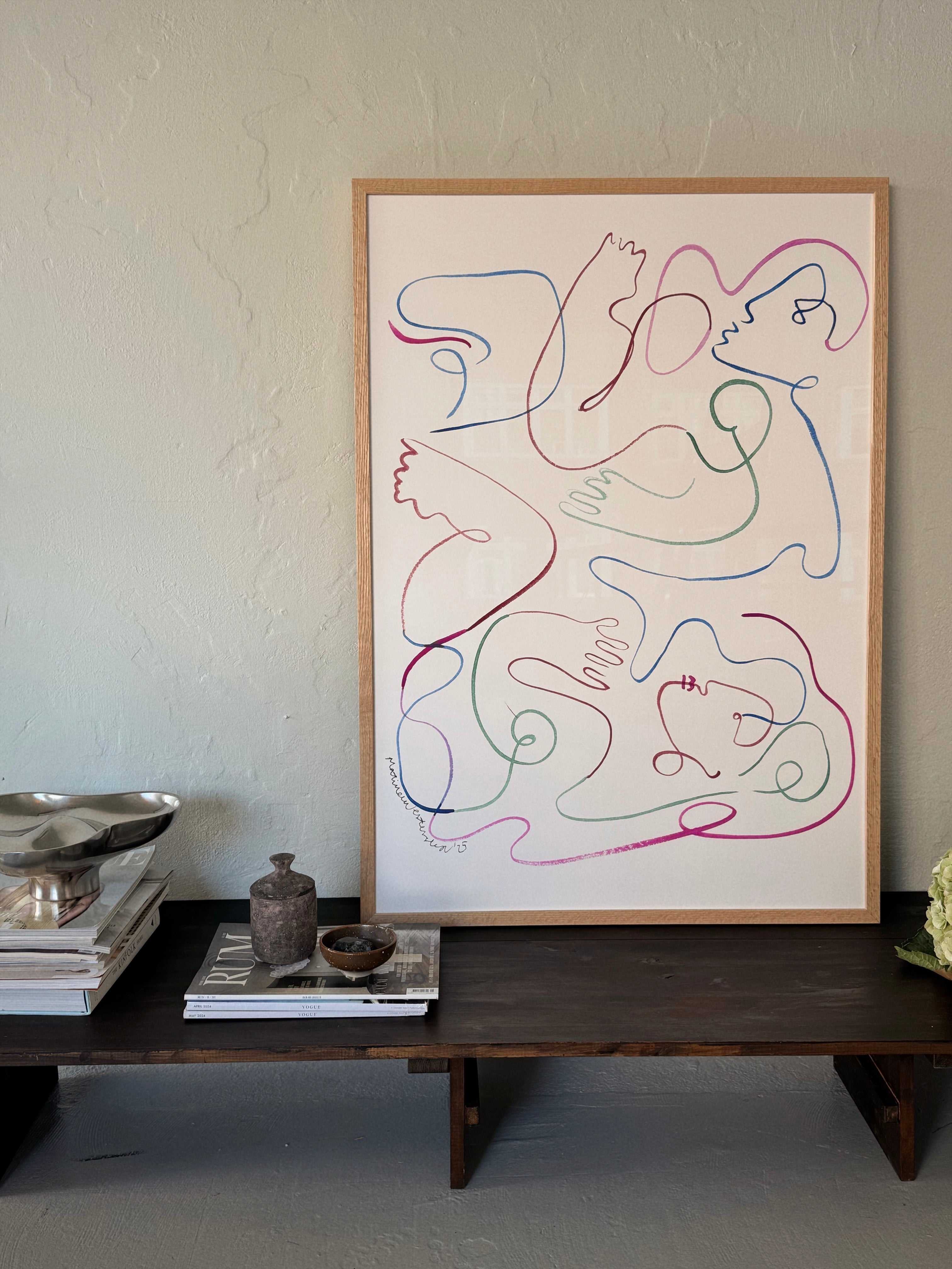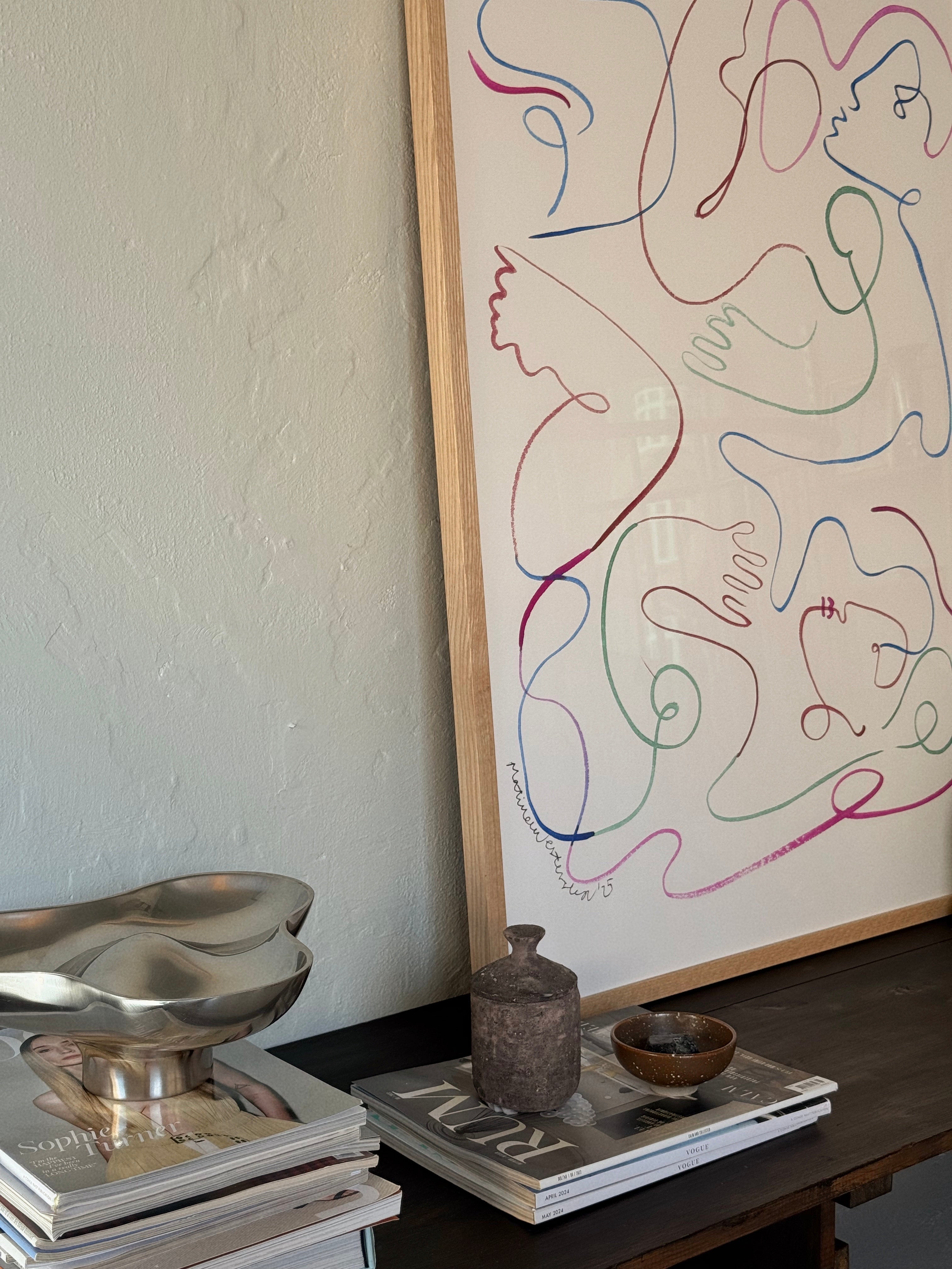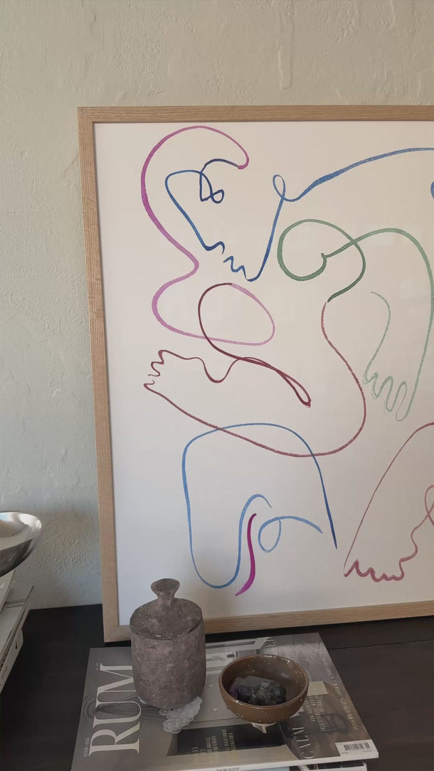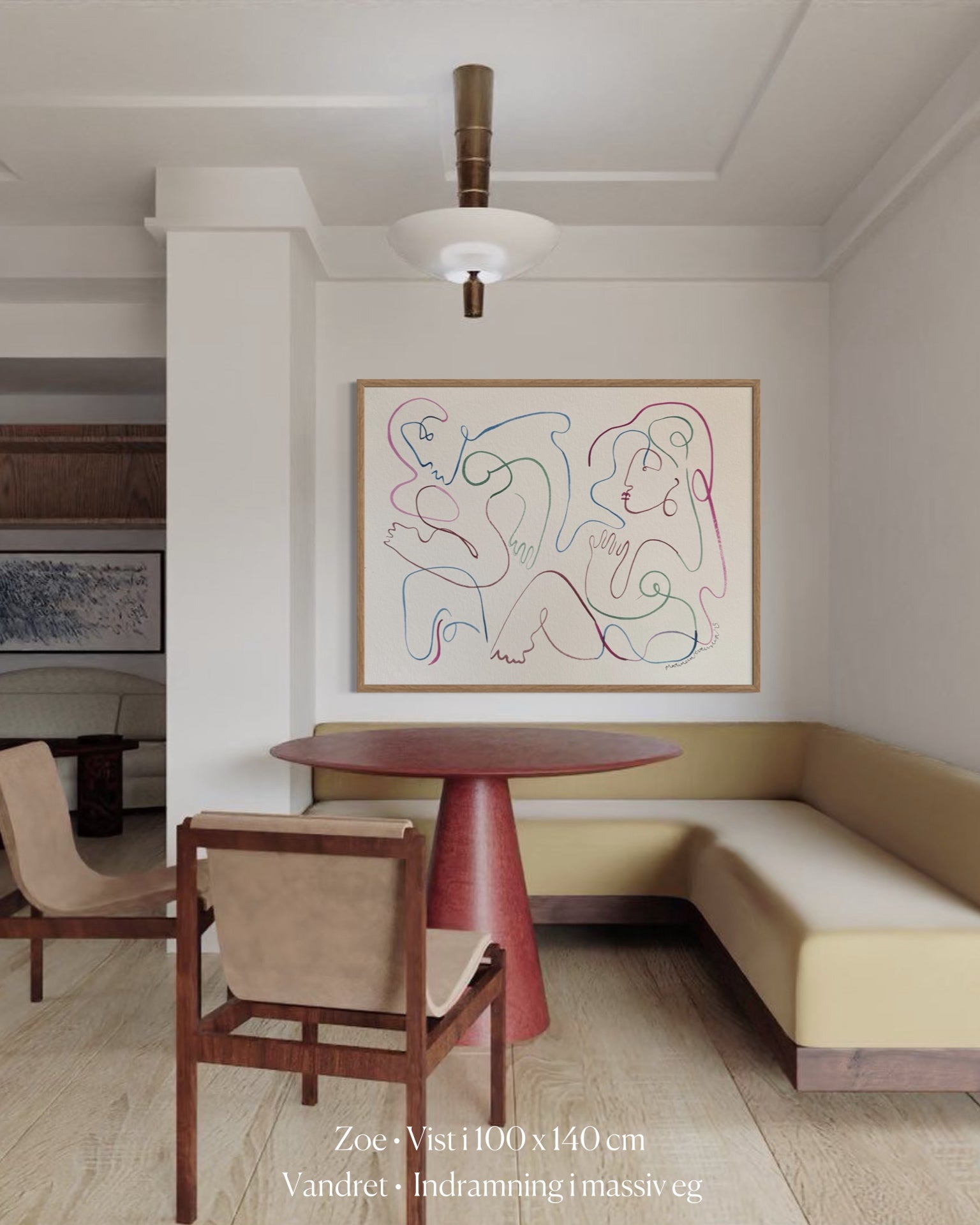 Zoe er et værk, man skal gå på opdagelse i – de to dansende kroppe træder først frem, når øjet følger de levende linjer. De subtile, men stærke farver giver rummet energi og et farverigt element, der aldrig overtager, men balancerer mellem leg og ro.