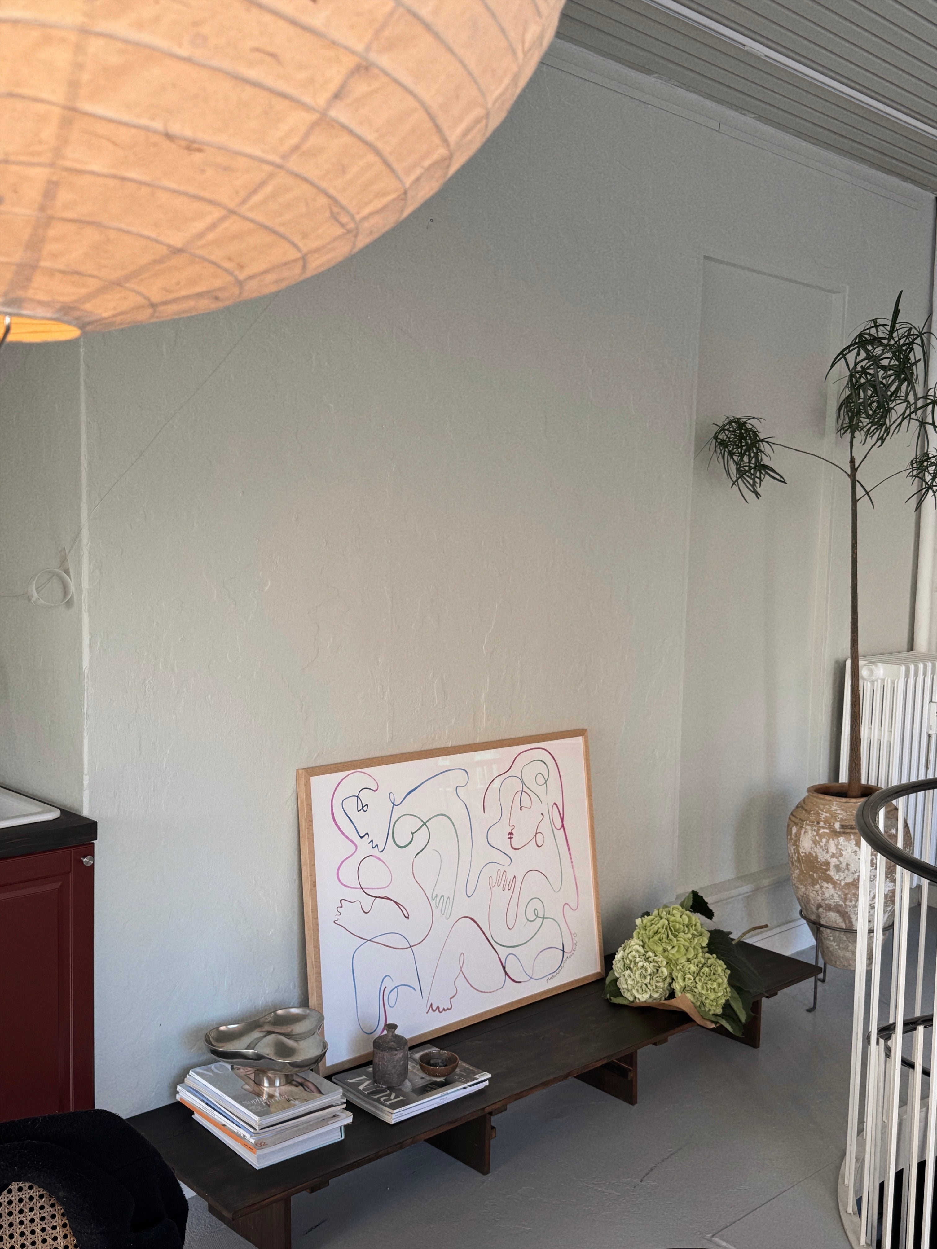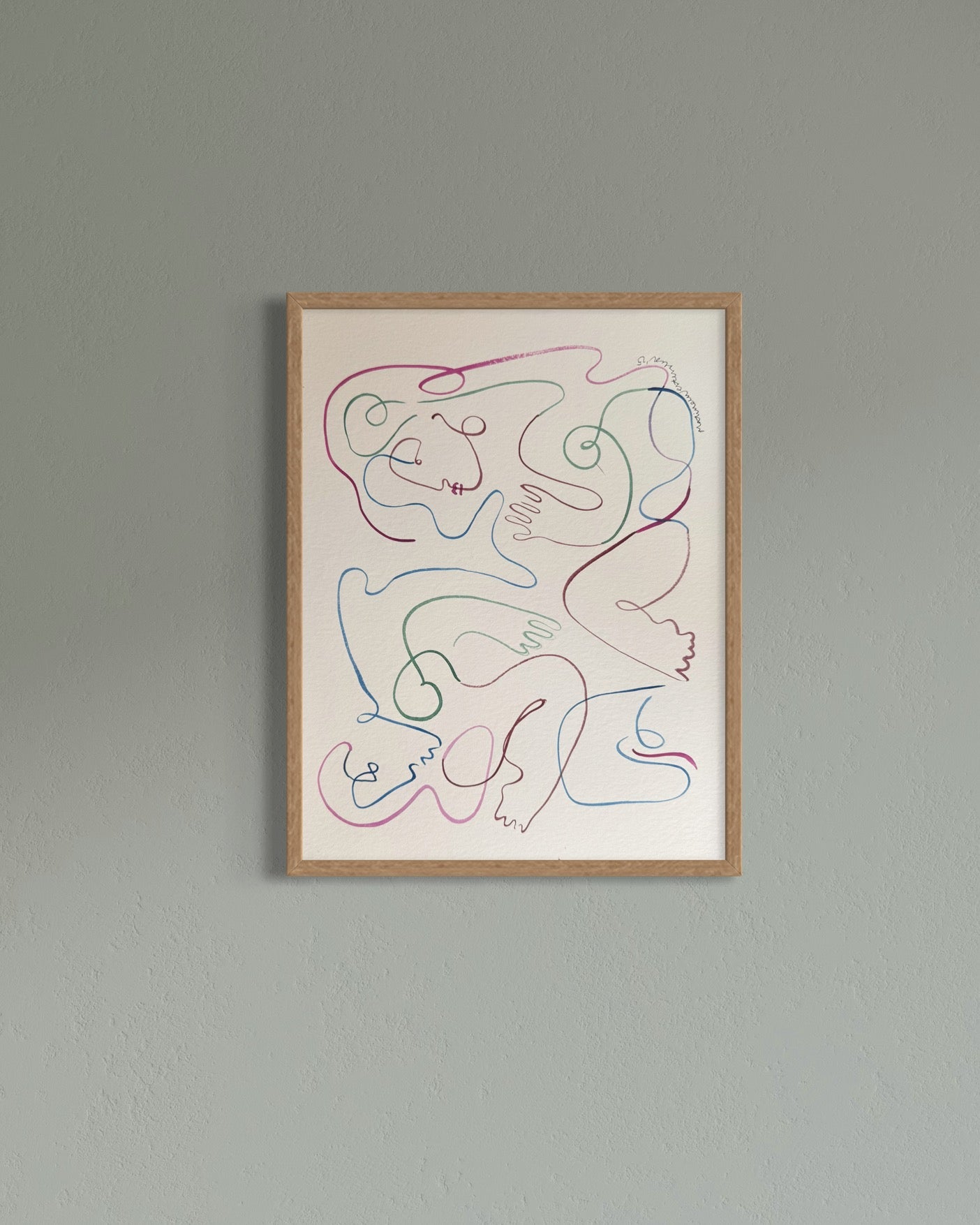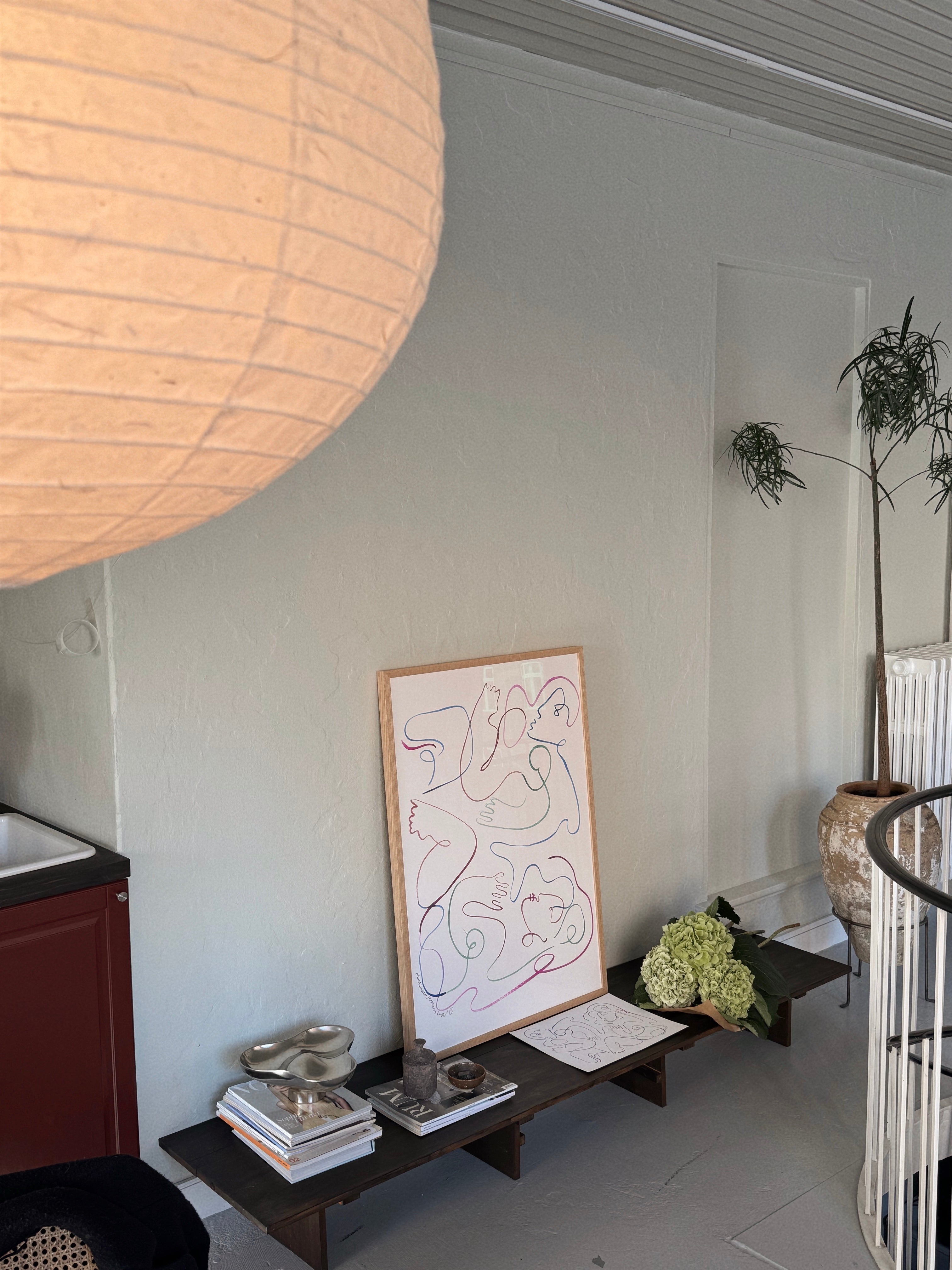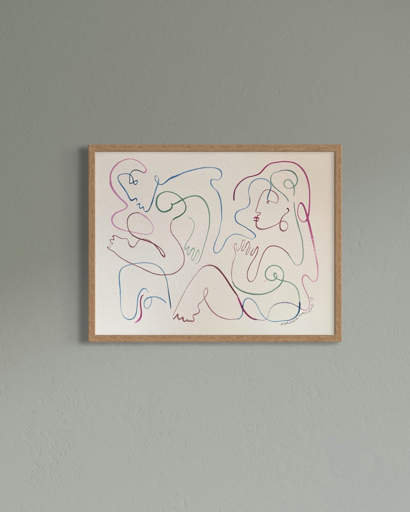 Zoe er et værk, man skal gå på opdagelse i – de to dansende kroppe træder først frem, når øjet følger de levende linjer. De subtile, men stærke farver giver rummet energi og et farverigt element, der aldrig overtager, men balancerer mellem leg og ro.