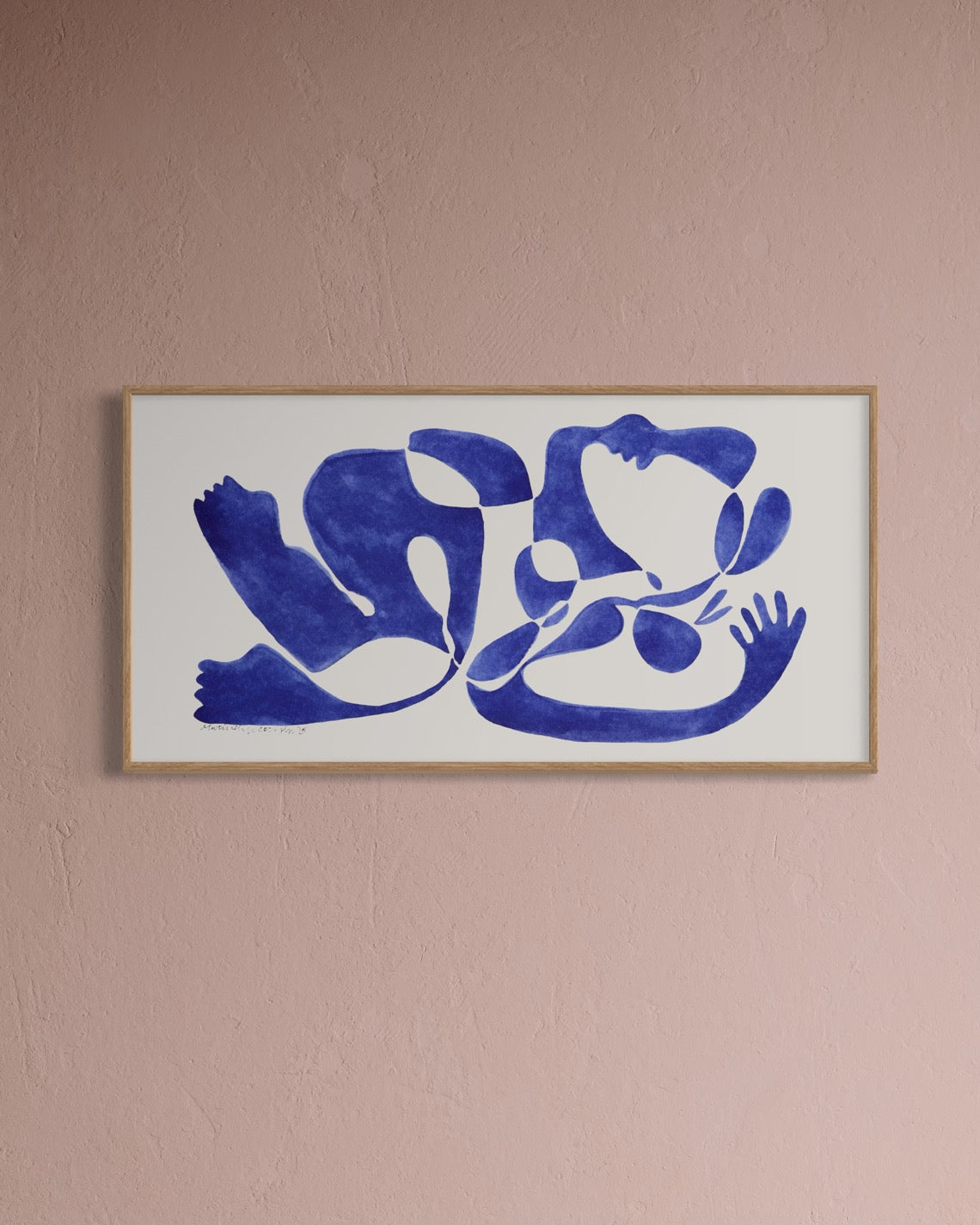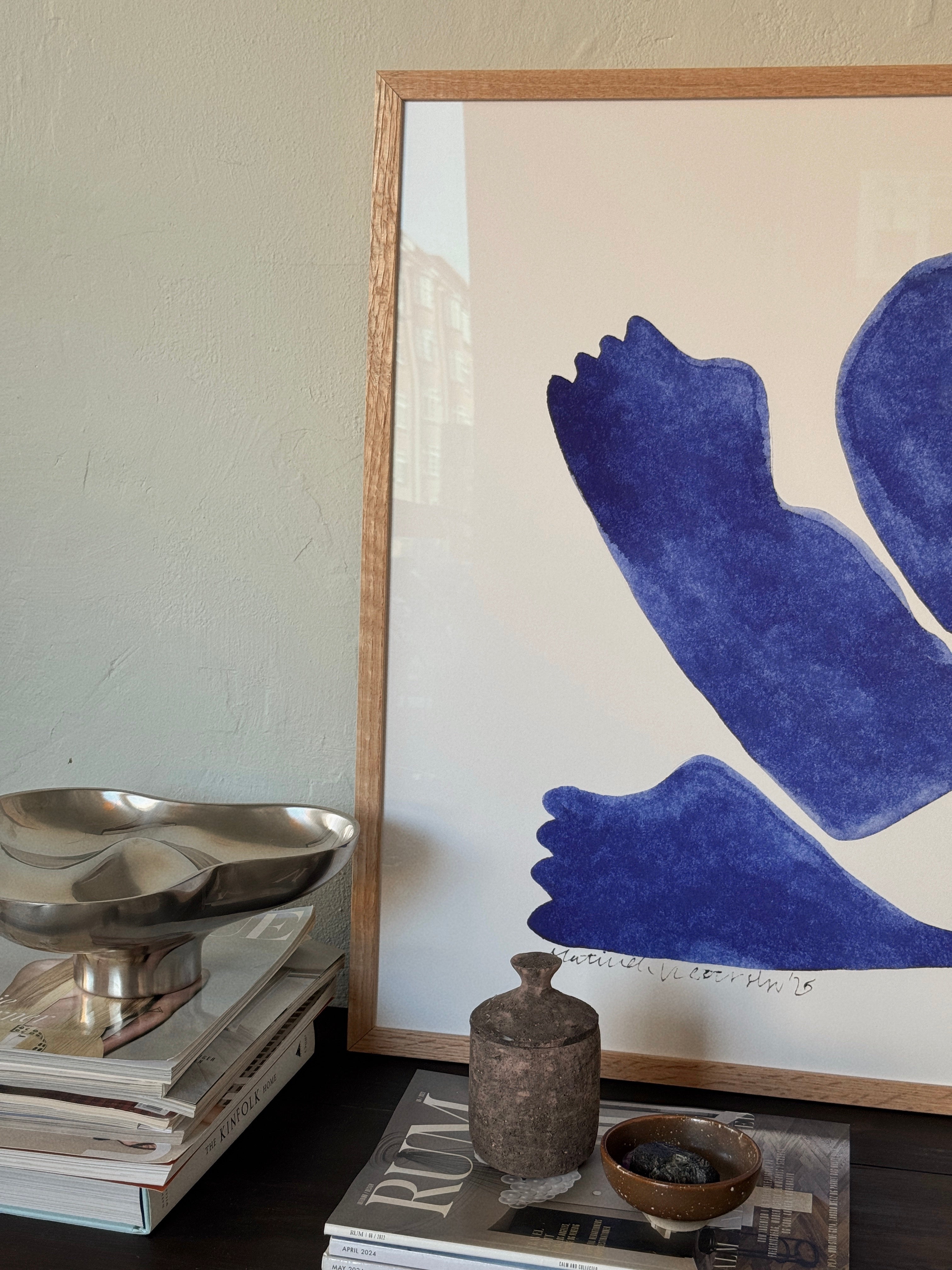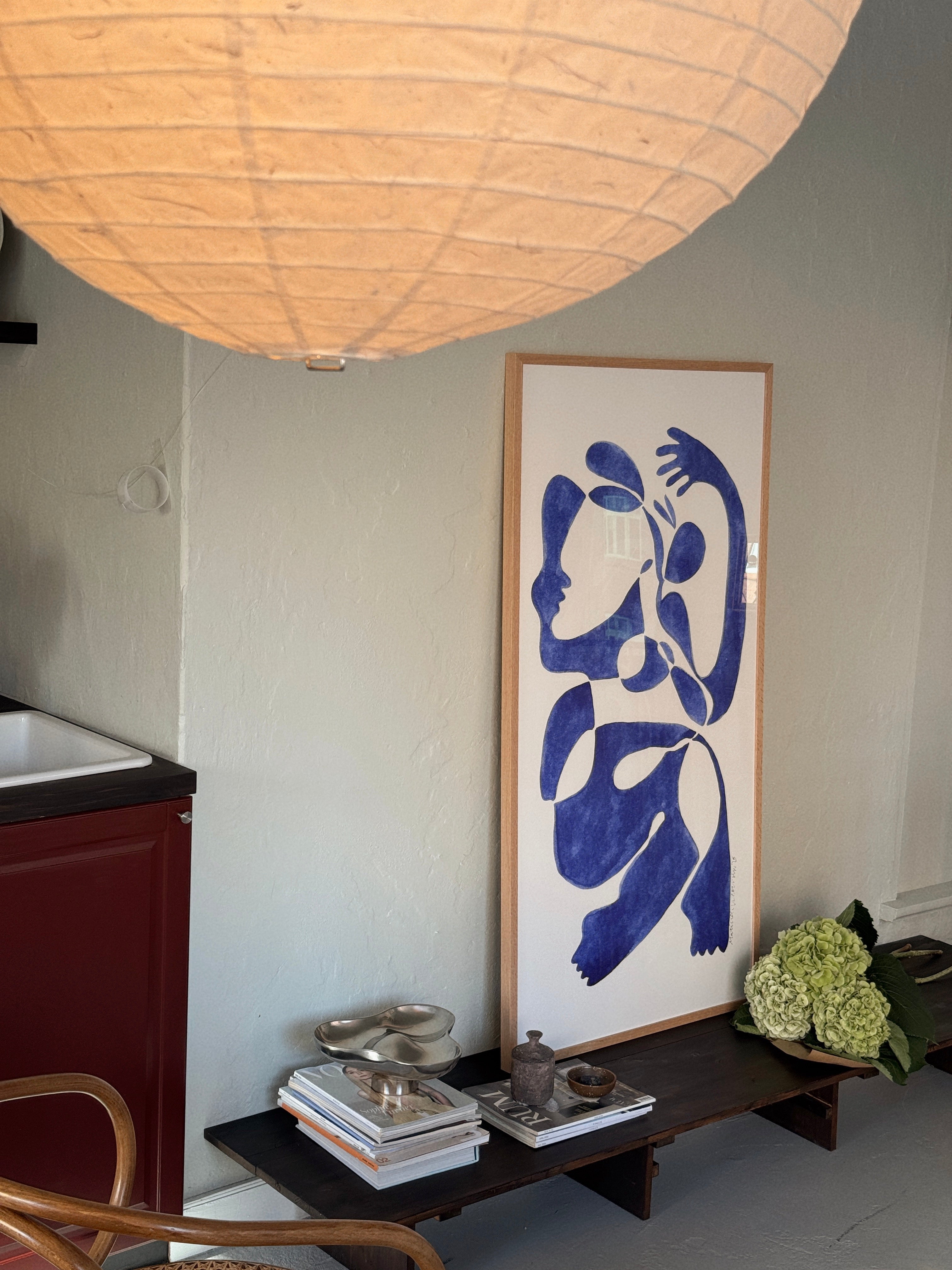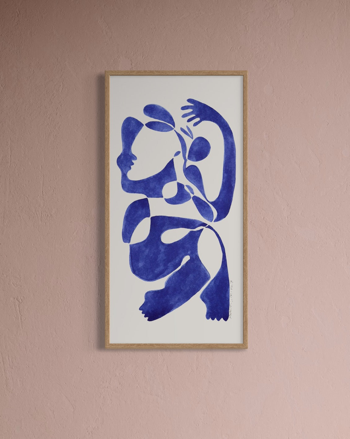Eos er skabt i en dyb og intens blå, en farve jeg selv bliver ved med at drages af. Værket er malet med akvarel, hvilket giver motivet en blødhed og en levende bevægelse i de varierende nuancer af farven. Kvinden træder frem i en abstrakt form, hvor øjet må gå på opdagelse for at finde hende. I sin favn holder hun en citrusfrugt – en subtil detalje midt i det organiske formsprog. Et værk, der kan vendes både lodret og vandret, og som inviterer dig til at kigge en ekstra gang.