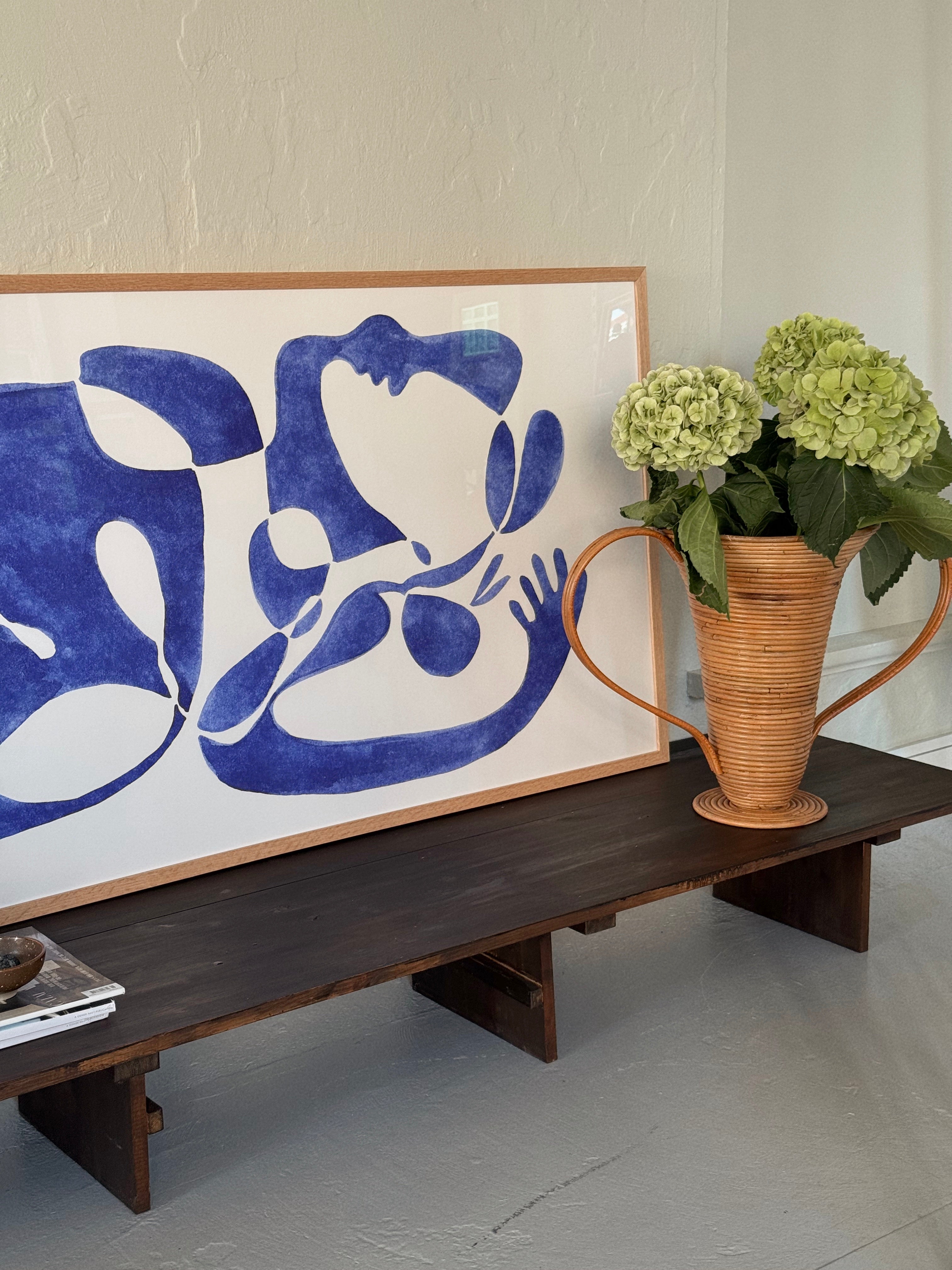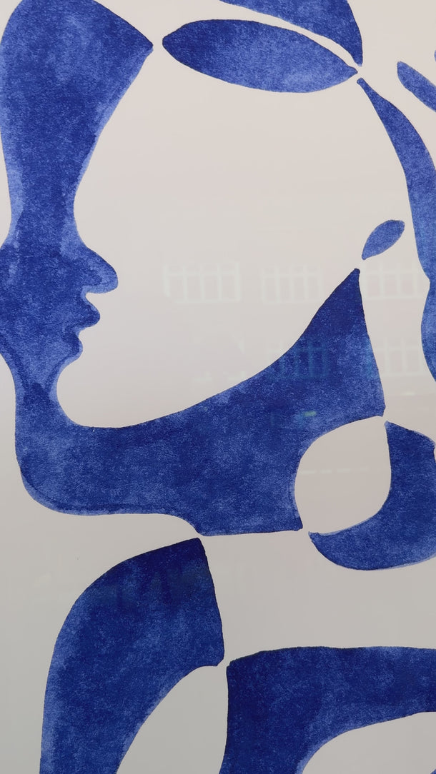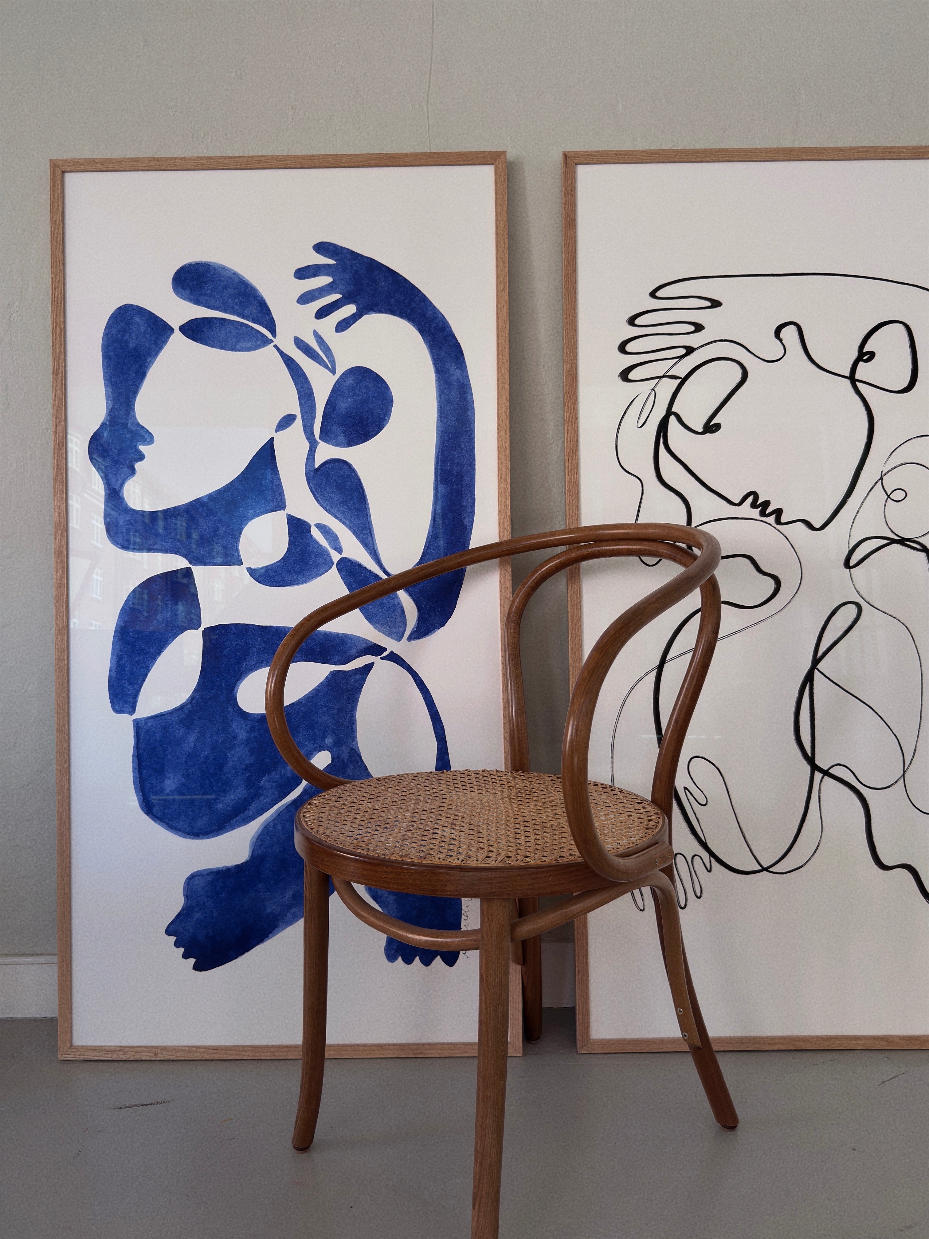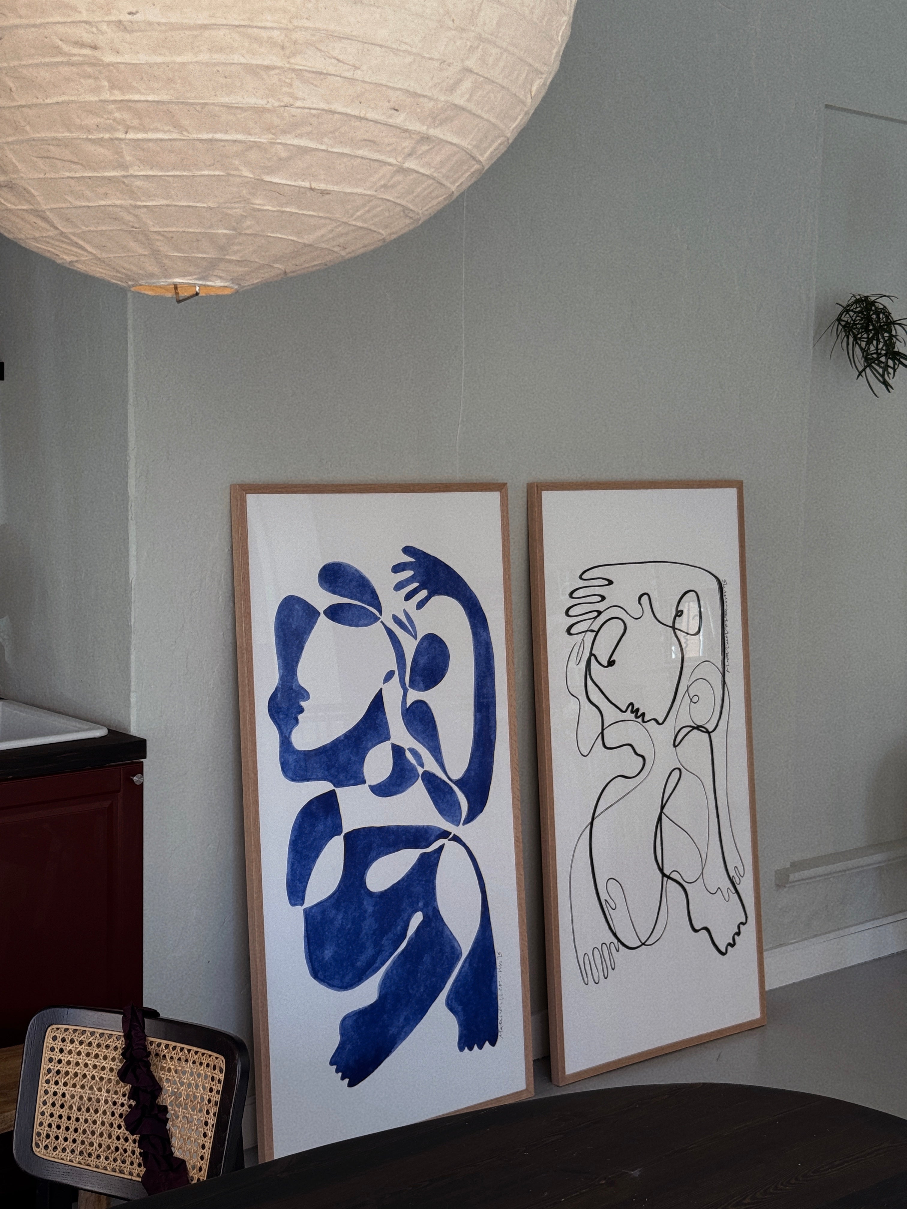 Eos er skabt i en dyb og intens blå, en farve jeg selv bliver ved med at drages af. Værket er malet med akvarel, hvilket giver motivet en blødhed og en levende bevægelse i de varierende nuancer af farven. Kvinden træder frem i en abstrakt form, hvor øjet må gå på opdagelse for at finde hende. I sin favn holder hun en citrusfrugt – en subtil detalje midt i det organiske formsprog. Et værk, der kan vendes både lodret og vandret, og som inviterer dig til at kigge en ekstra gang.