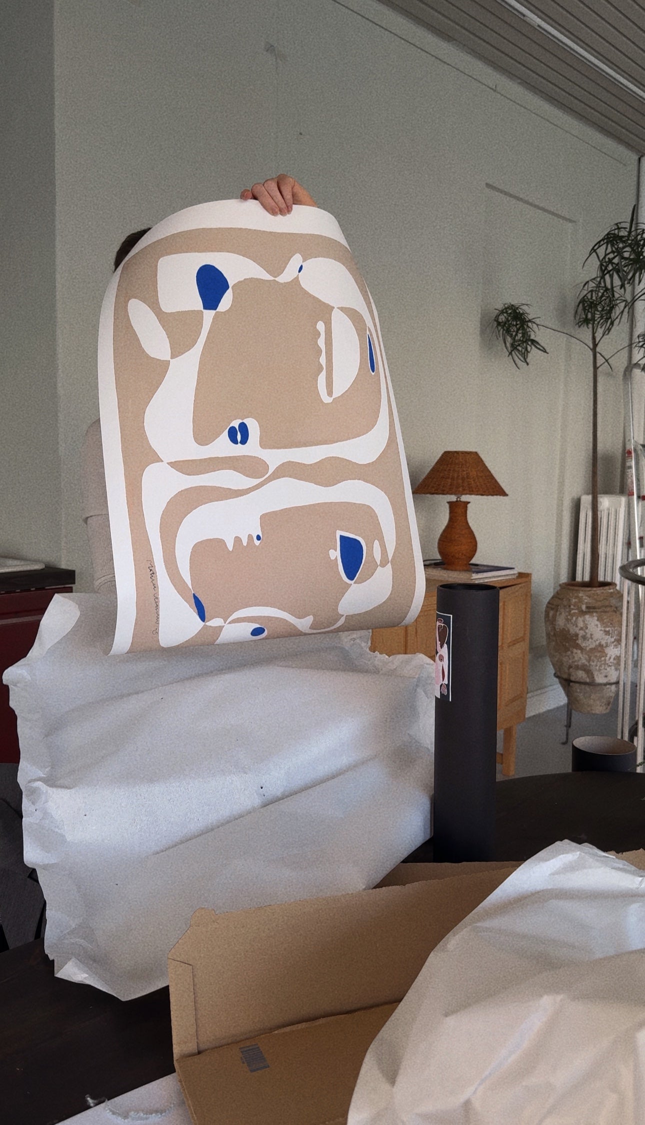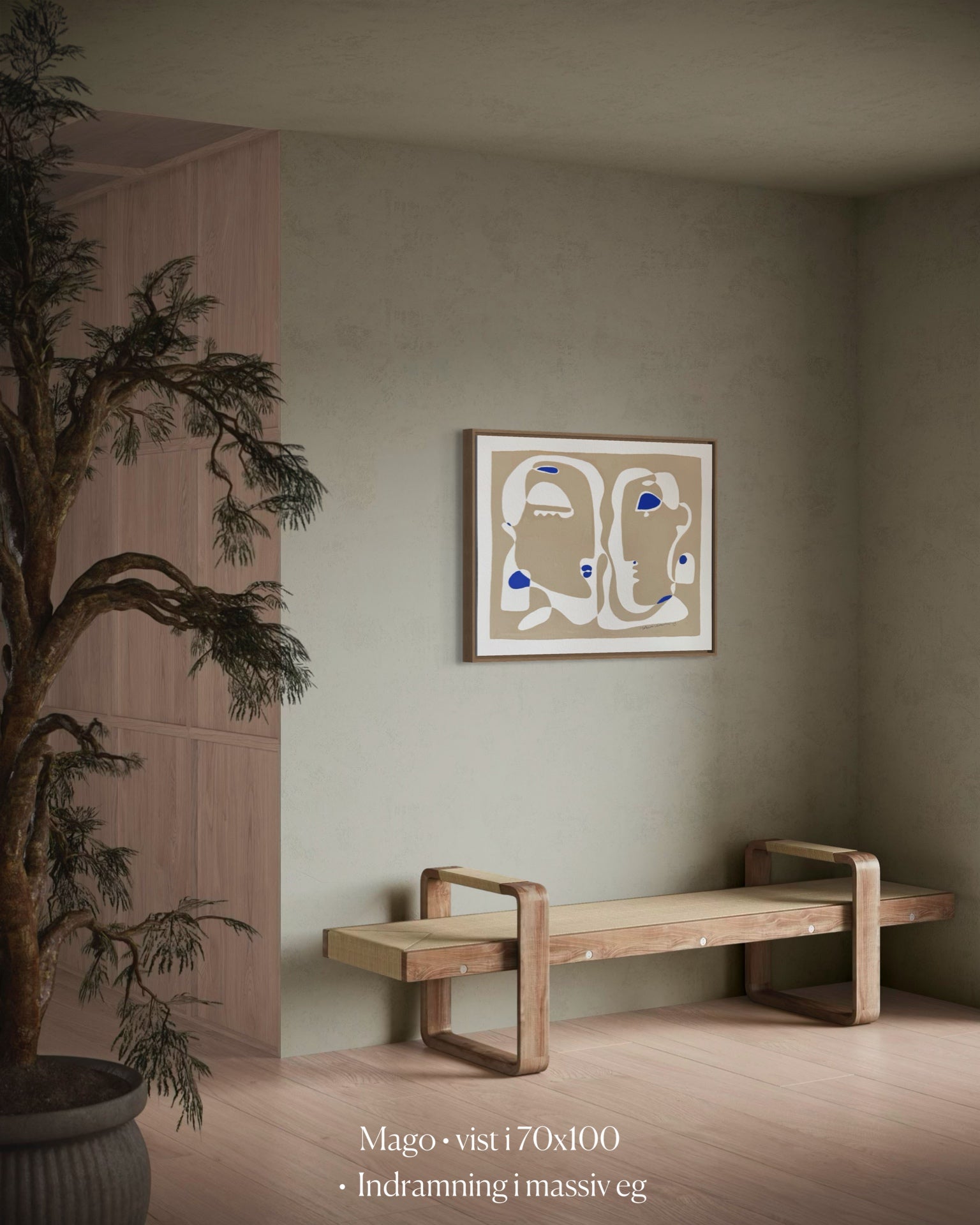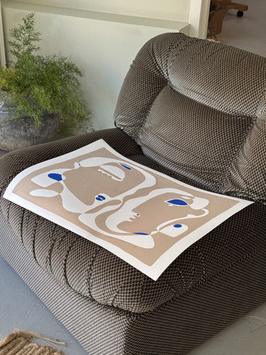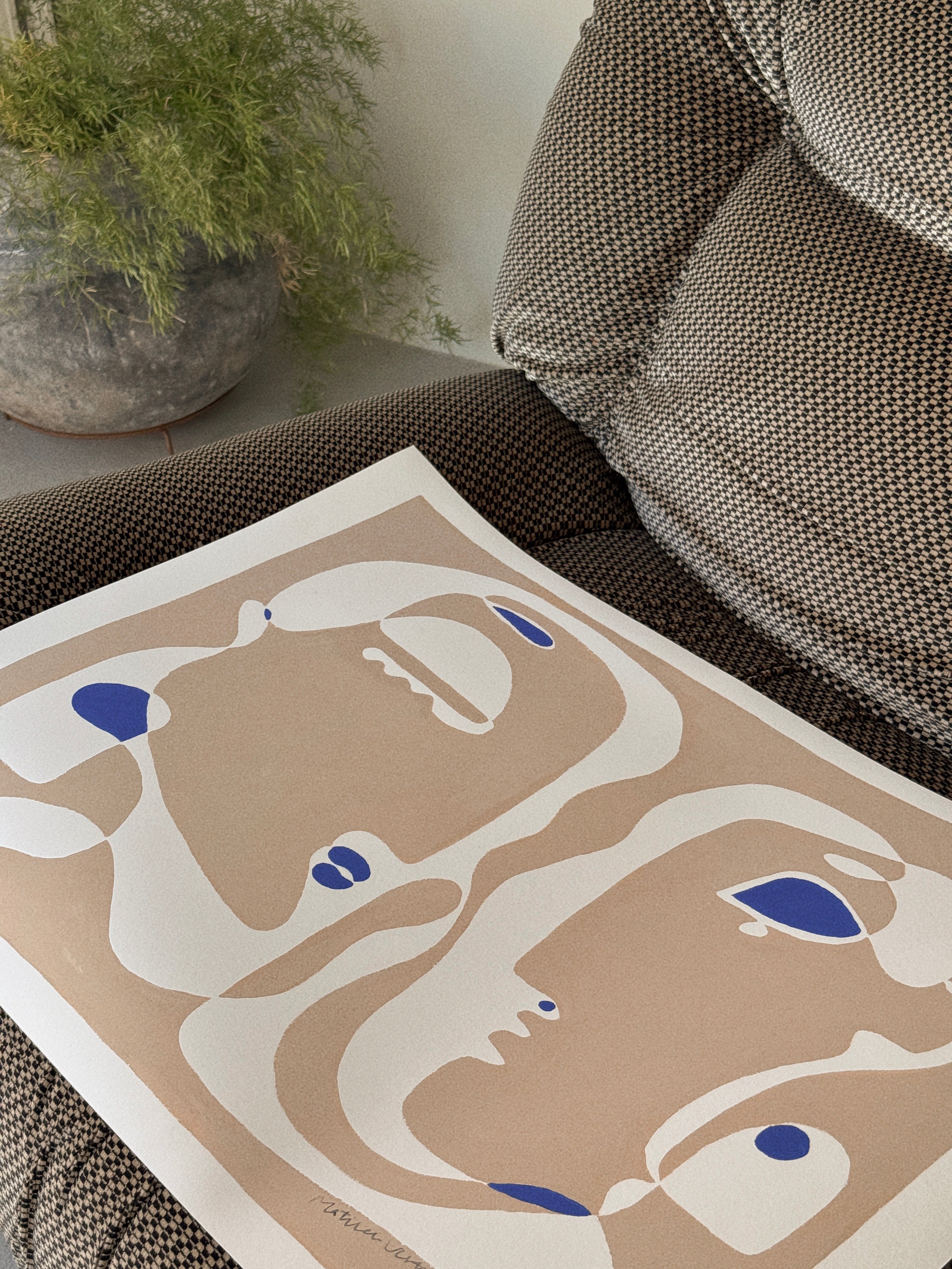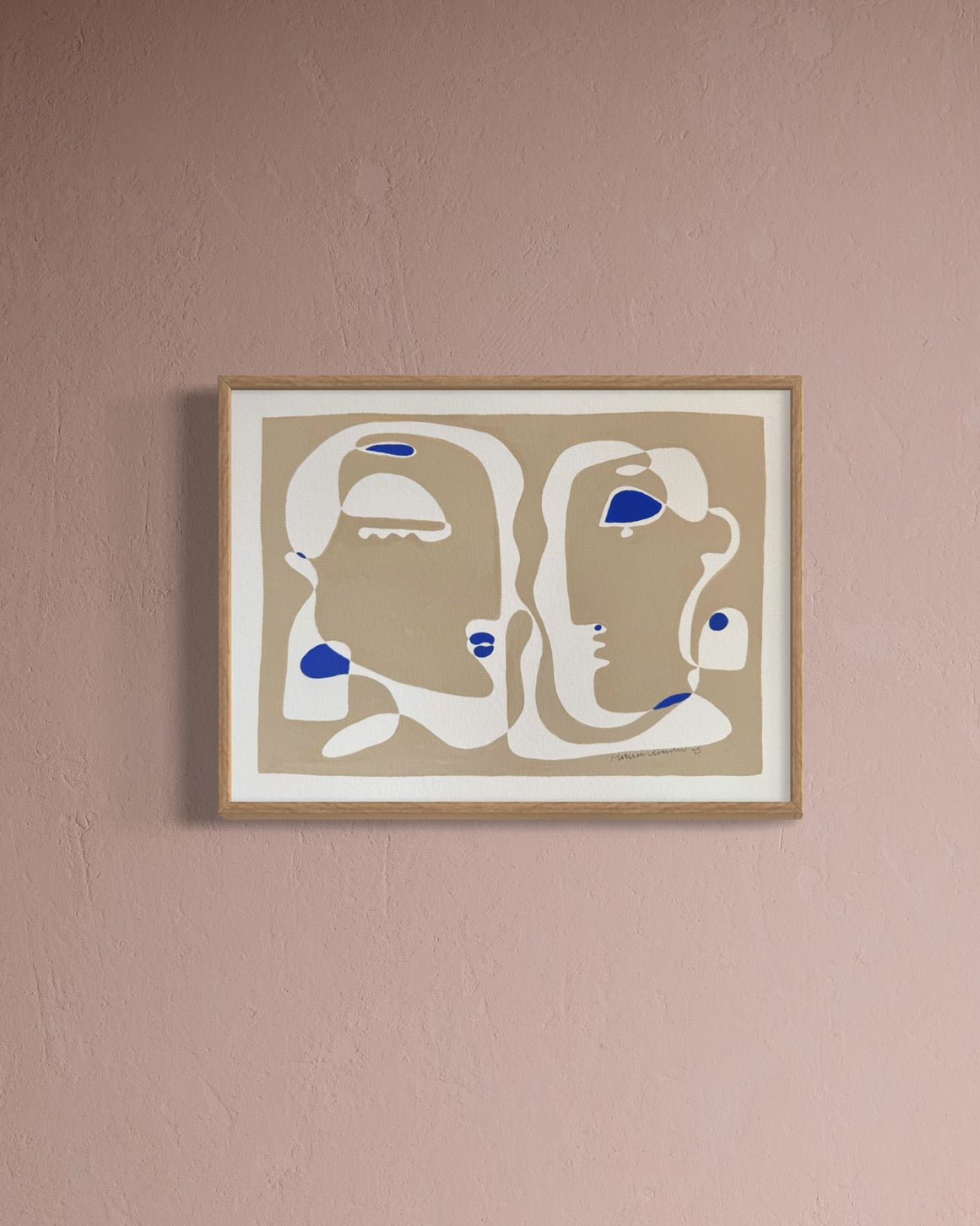 Mago viser to ansigter, der vokser ud af samme form og mødes i et fælles blik. De bløde beige og hvide flader skaber en følelse af harmoni, mens de klare blå detaljer bryder roen og tilfører værket energi. Et billede på relationen mellem to mennesker – forskelligheder, der alligevel bindes sammen i et fælles nærvær.