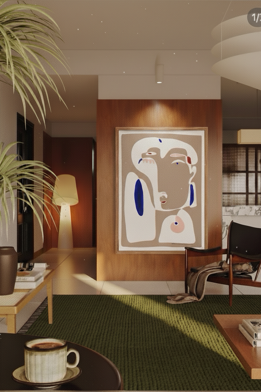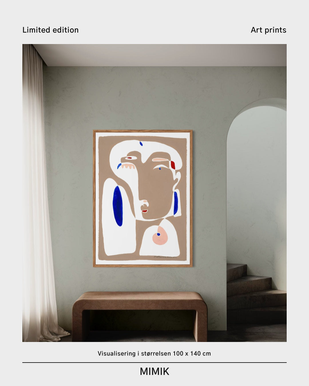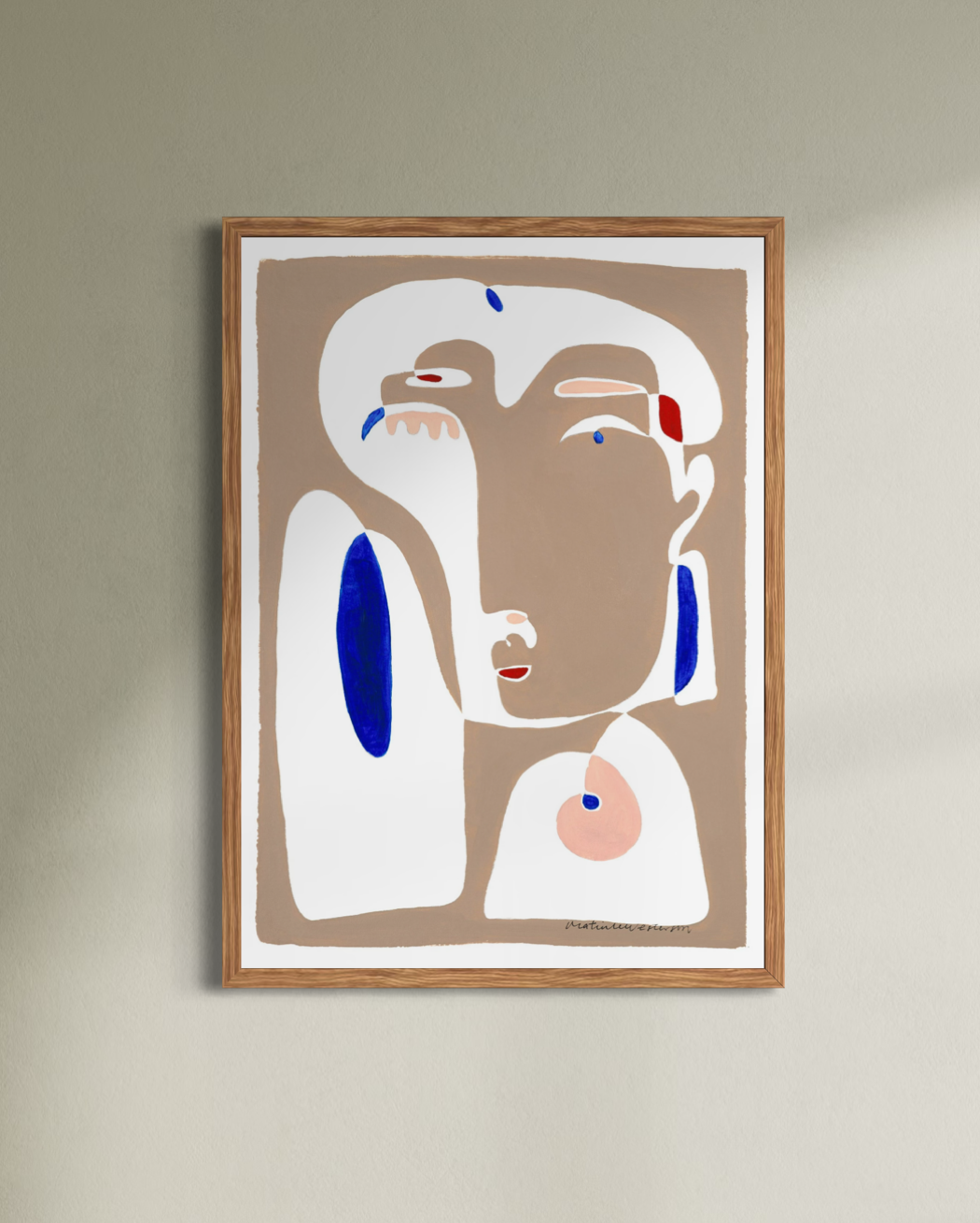 De varme beige og hvide flader brydes af blå og røde detaljer, som skaber spænding i det rolige ansigt. Et studie i det subtile – hvor mimik, form og flade glider sammen.