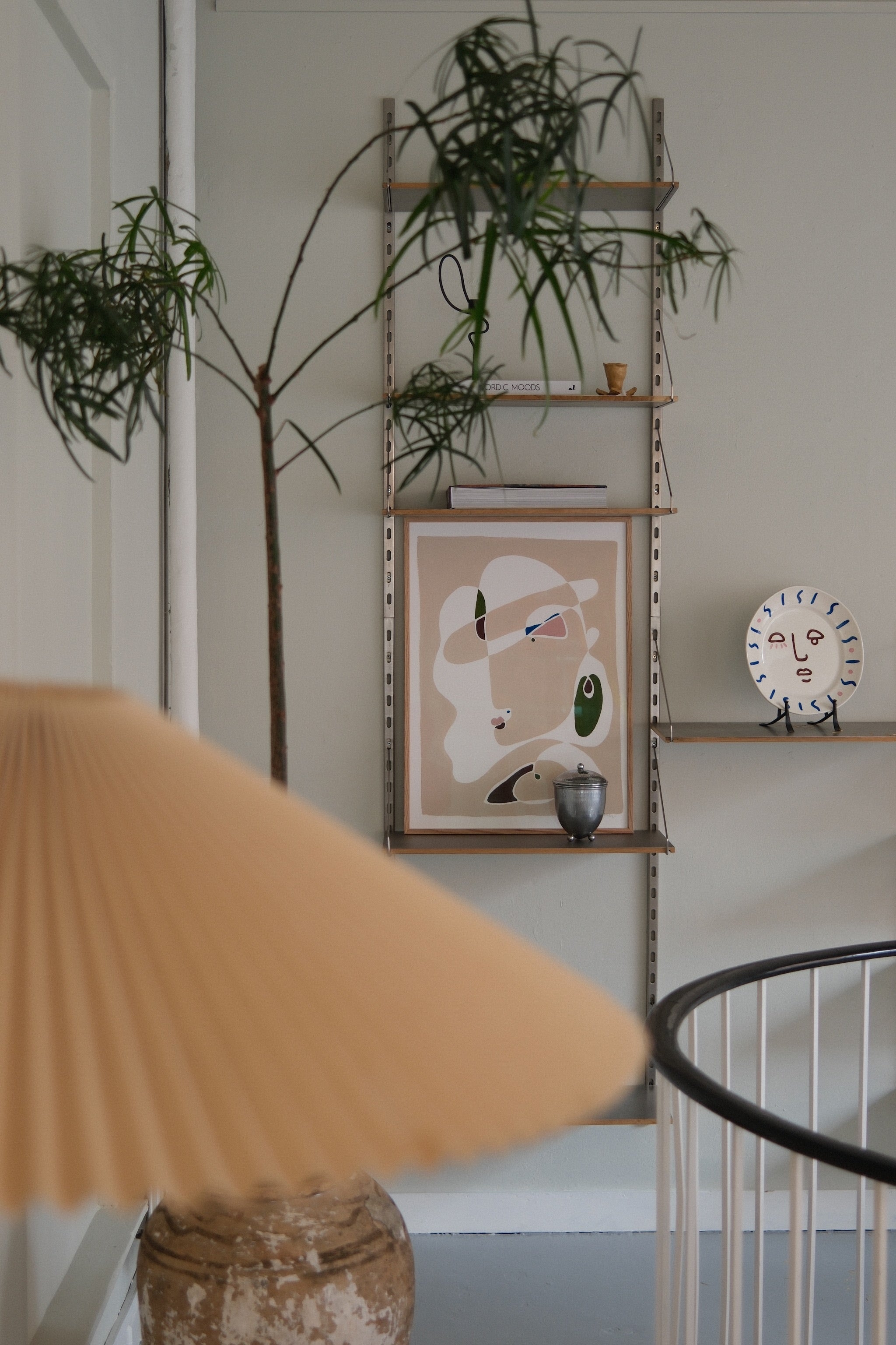 De små felter af intens farve bryder fladerne og tilfører energi og bevægelse til det ellers afdæmpede udtryk. Motivet balancerer mellem stilhed og spænding, hvor forskydninger i form og farve skaber liv i kompositionen. Den hvide kant omkring værket giver luft og forankrer helheden.