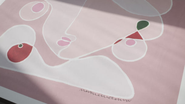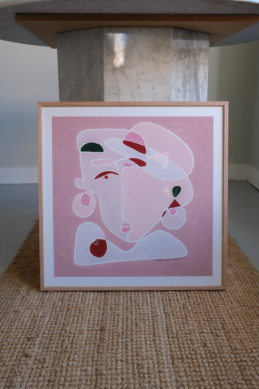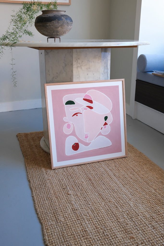 Den kvadratiske form holder motivet samlet og giver ro, mens de lyse pink flader lader udtrykket være let. Små felter af farve tilfører bevægelse og energi – netop nok til, at værket forbliver levende uden at miste sin blidhed.