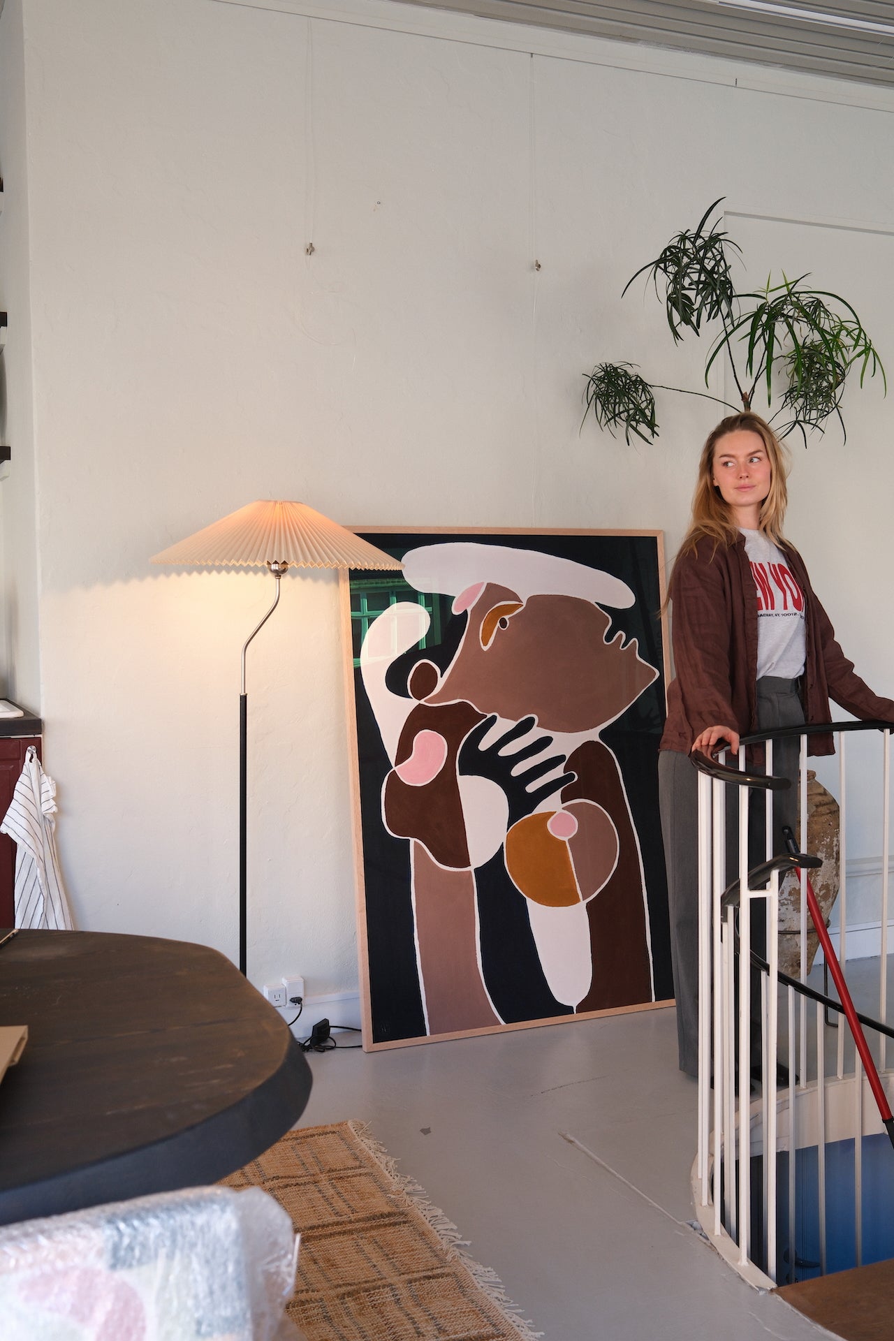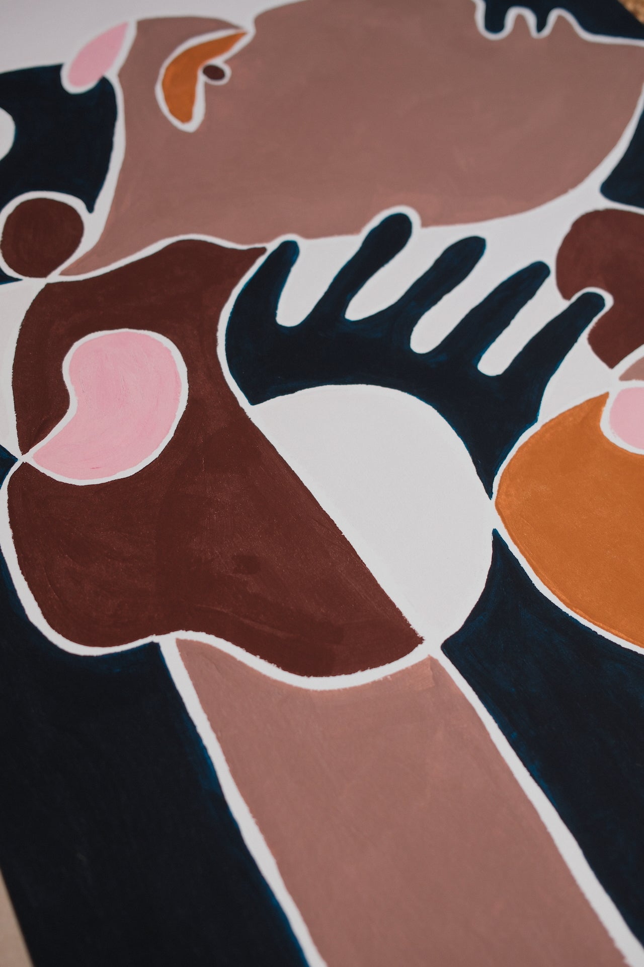 De mørkere farver omkring figuren skaber kontrast og dybde, mens kroppen fremstår samlet og nærværende. Værket tager udgangspunkt i selvkontakt og det stille rum, der kan opstå, når man giver sig selv lov til at være tæt på sig selv.
