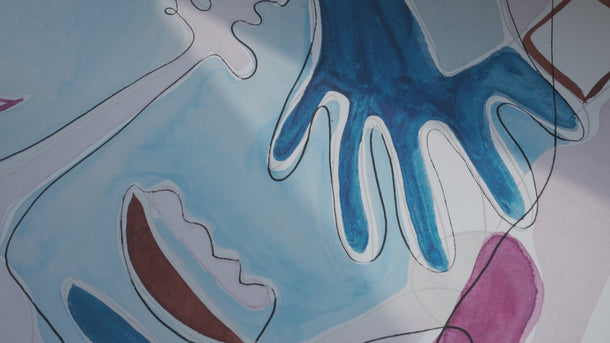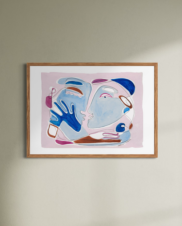 Figurerne glider ind i hinanden gennem form og bevægelse, men uden at smelte helt sammen. Hænder, ansigter og flader ligger tæt, adskilt af små forskydninger, hvor relationen opstår. Den hvide passepartout skaber ro omkring motivet og giver bevægelsen plads, så værkets livlighed balanceres og forankres.