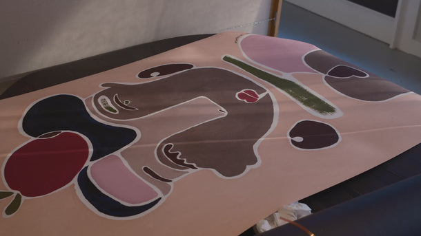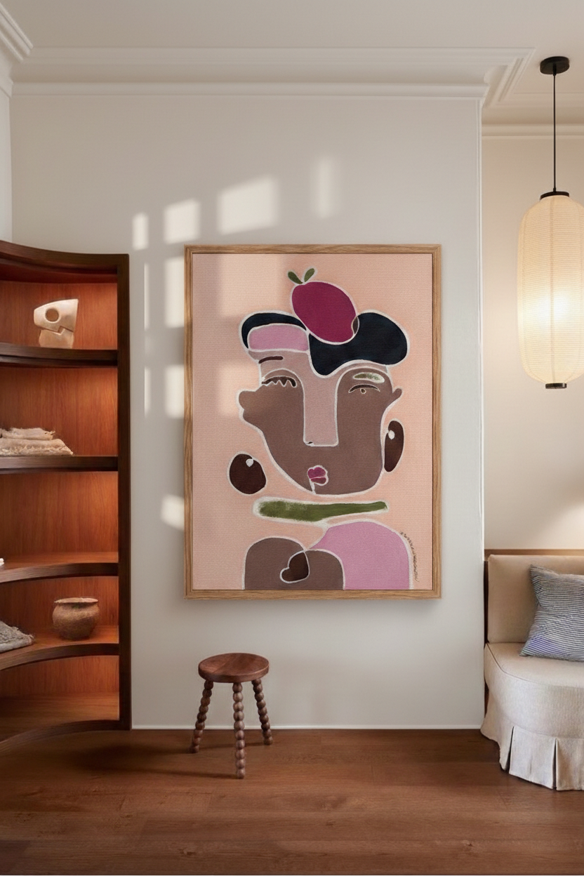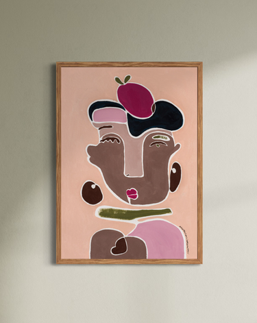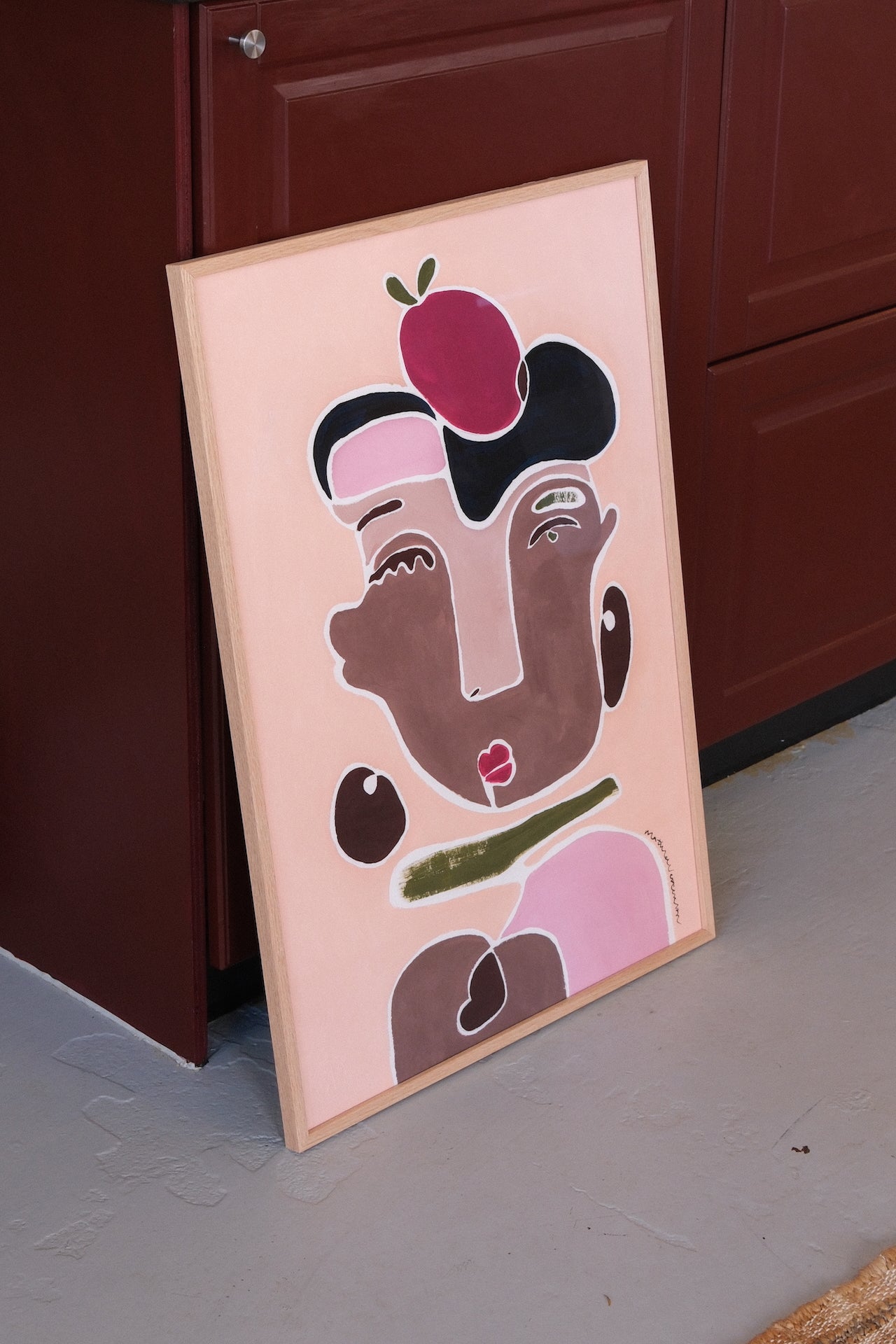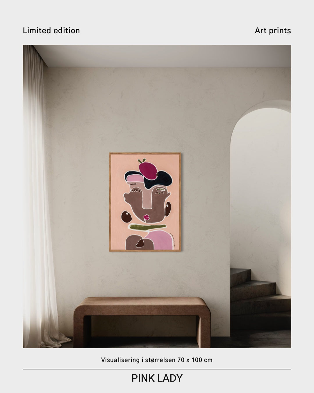 Pink Lady forestiller en kvinde med et æble balanceret mod hovedet. Figuren er opbygget i bløde pink nuancer og varme jordfarver, som giver motivet en rolig, næsten vægtløs karakter.