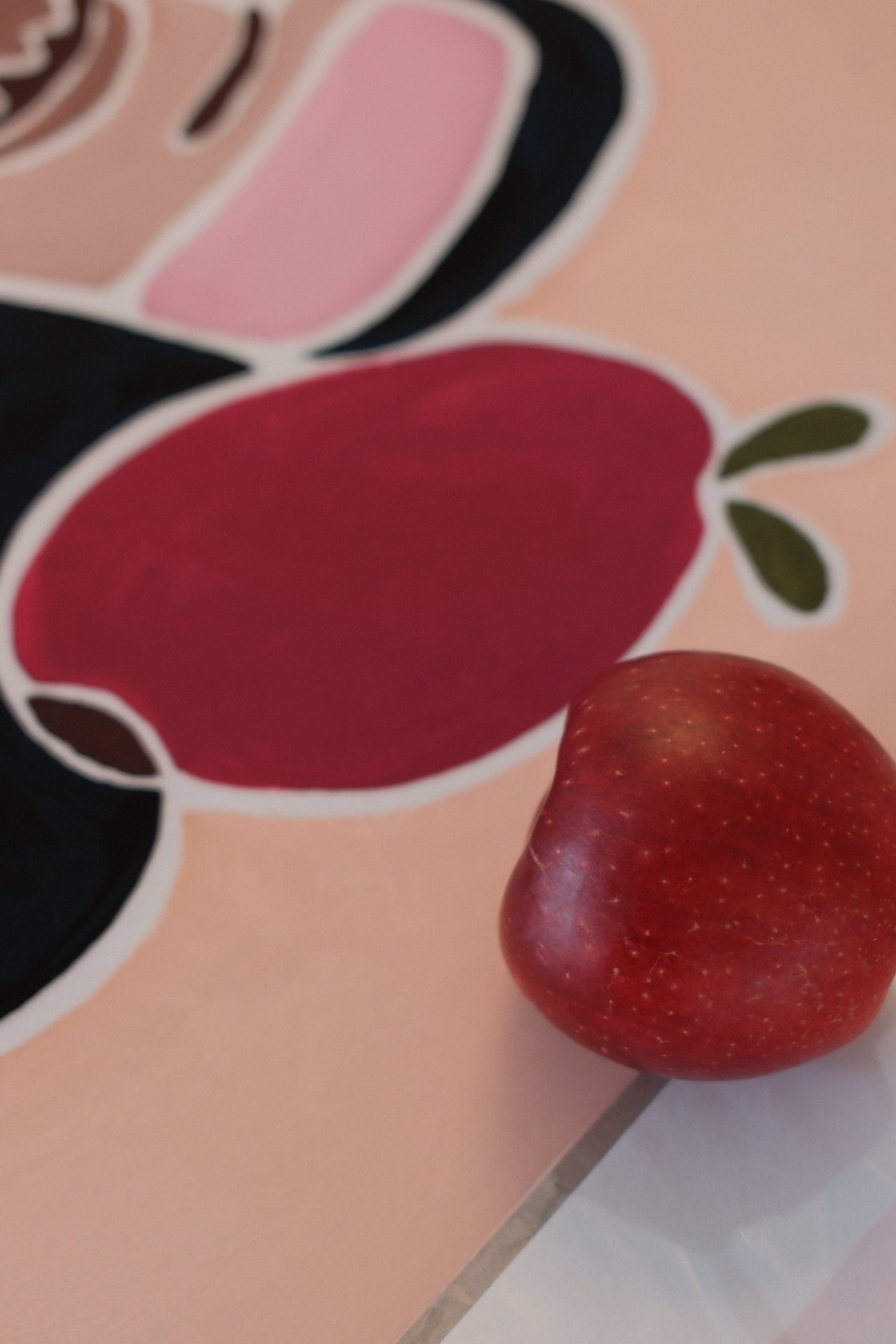 Æblet fungerer som et enkelt fokuspunkt i kompositionen og samler kroppens bevægelse i et stille øjeblik af balance. Et værk, der kredser om opmærksomhed, gentagelse og det lille spændingsfelt mellem krop og objekt.