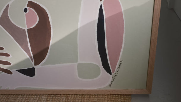 Farver: Brune nuancer, lyserøder nuancer, sort og detaljer i koboltblå på en lys støvet grøn baggrund