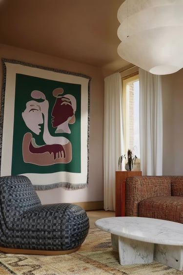 Tæppet er baseret på en håndtegnet idé, omsat til vævet tekstil – en fortælling i 100% tyk bomuld.